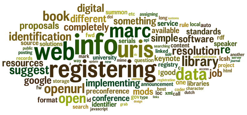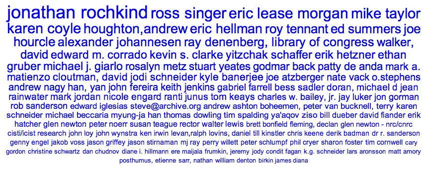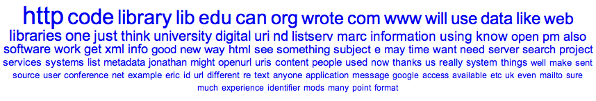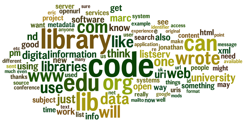 I wanted to analyze the content of a couple of the mailing lists I own/moderate, specifically Code4Lib and NGC4Lib. Who are the most frequent posters? What words are used most often in the subject lines, and what words are used most often in the body of the messages? Using a hack I wrote (mine-mail.pl) I was able to generate simple tables of data: