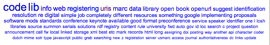 I then fed these tables to Wordle to create cool looking images. I also fed these tables to a second hack (dat2cloud.pl) to create not-even-close-to-valid HTML files in the form of hyperlinked tag clouds. Below is are the fruits of these efforts: