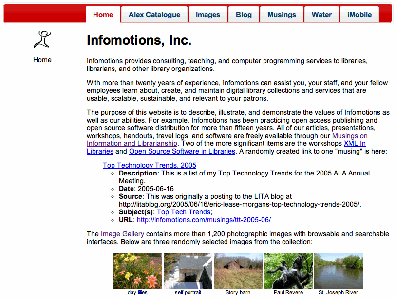1. iMobile – A rough mobile interface to much of the Infomotions domain. Written a little more than a year ago, it combines backend Perl scripts with the iUI Javascript framework to render content. Now that I look back on it, the hacks there are pretty impressive, if I do say so myself. Of particular interest is the image gallery which gets its content from OAI-PMH data stored on the server, and my water collection which reads an XML file of my own design and plots where the water was collected on a Google map. iMobile was created from the knowledge I gained from Safari And WebKit Development For iPhone OS 3.0.
