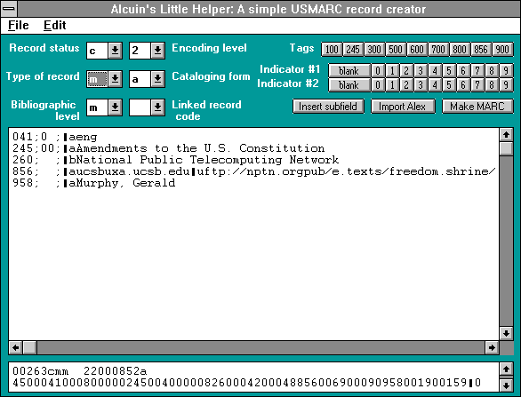 In short, Alcuin's Little Helper is a very simple MARC record editor. It can be used to create MARC records by hand or convert Monroe's tagged output to MARC records.